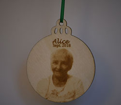A plaque engraved on finished 1/8” birch wood and with a black-four inch high plastic stand.