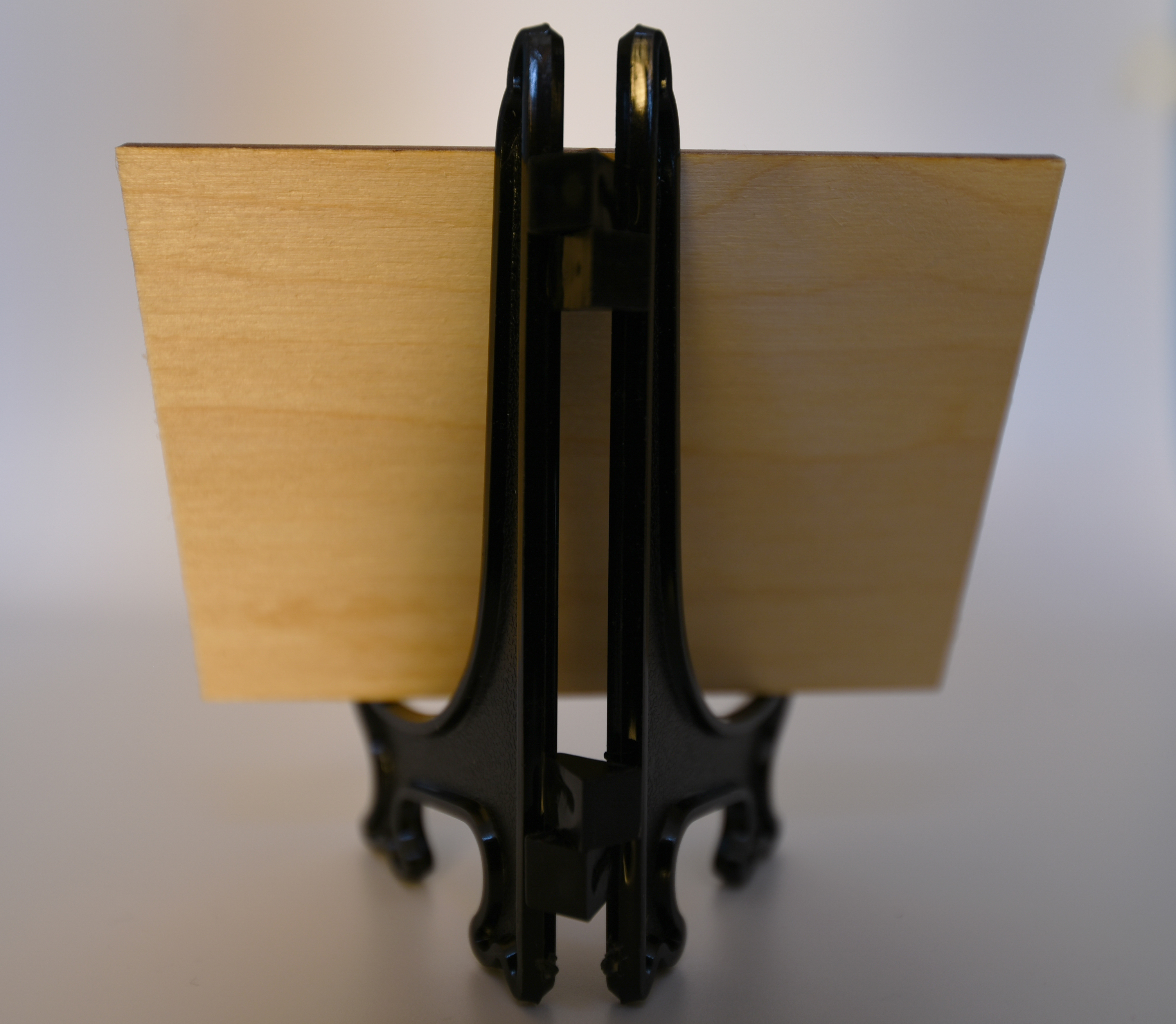 A plaque engraved on finished 1/8” birch wood and with a black-four inch high plastic stand.